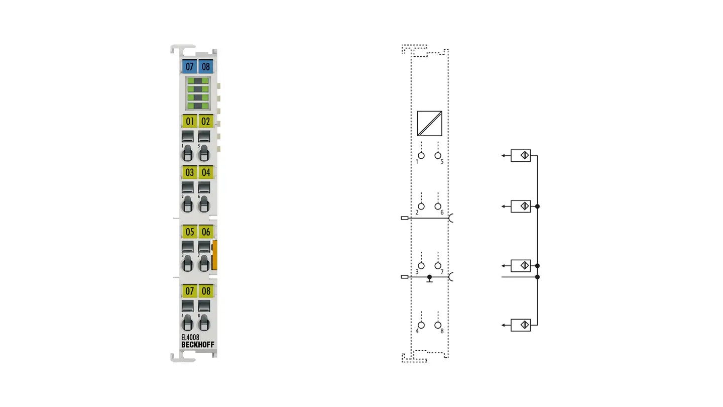 Die analoge Ausgangsklemme EL4008 erzeugt Signale im Bereich von 0 bis 10 V. Die Spannung wird mit einer Auflösung von 12 Bit galvanisch getrennt zur Prozessebene transportiert. Die Ausgangskanäle der EtherCAT-Klemme besitzen ein gemeinsames Massepotenzial. Die EL4008 vereint acht Kanäle in einem Gehäuse. Die Ausgangsstufen werden durch die 24-V-Versorgung gespeist. Der Signalzustand der EtherCAT-Klemme wird durch Leuchtdioden angezeigt.