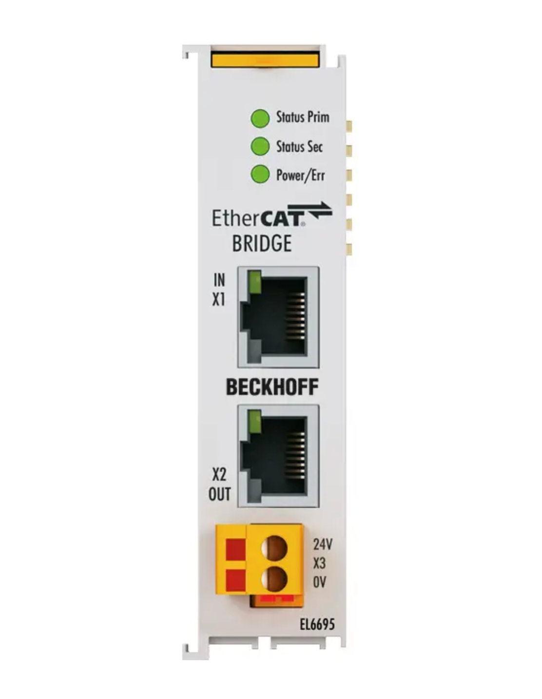Die EtherCAT-Bridge-Klemme EL6695 ermöglicht den Echtzeit-Datenaustausch zwischen EtherCAT-Strängen und unterschiedlichen Mastern. Auch die asynchrone Kommunikation über AoE, FoE, EoE, VoE usw. wird unterstützt. Die Synchronisierung der Distributed Clocks ist in beide Richtungen möglich. Die EL6695 hebt sich von der weiterhin verfügbaren EL6692 durch flexible CoE-Konfiguration und einer deutlichen Steigerung des Datendurchsatzes ab. Eine komfortable Konfigurationsoberfläche im TwinCAT System Manager steht wie bei der EL6692 zur Verfügung. Die Spannungsversorgung der Sekundärseite (RJ45) erfolgt über einen externen Anschluss, die Primärseite wird über den E-Bus gespeist. Die Bridge-Klemme kann auch verwendet werden, um ein unterlagertes PC-System als EtherCAT-Slave einzubinden.
